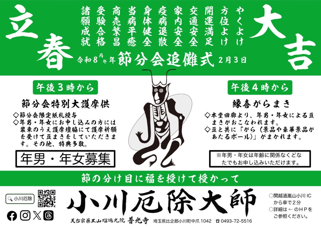 古来より、立春の前日の節分は運勢が大きく変わる節目であるとして重要視されてきました。この節目に邪気をはらい福善を生む追儺式が古く(八世紀ごろ)から各地で行われています。
